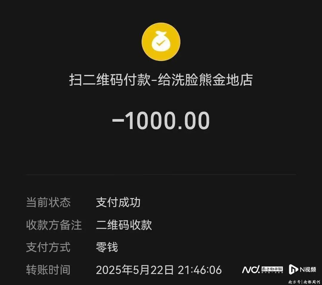 吴小姐提供的截图显示,她于今年5月22日向洗脸熊金地店付款了1000元,8月28日,她收到了198元的退款。